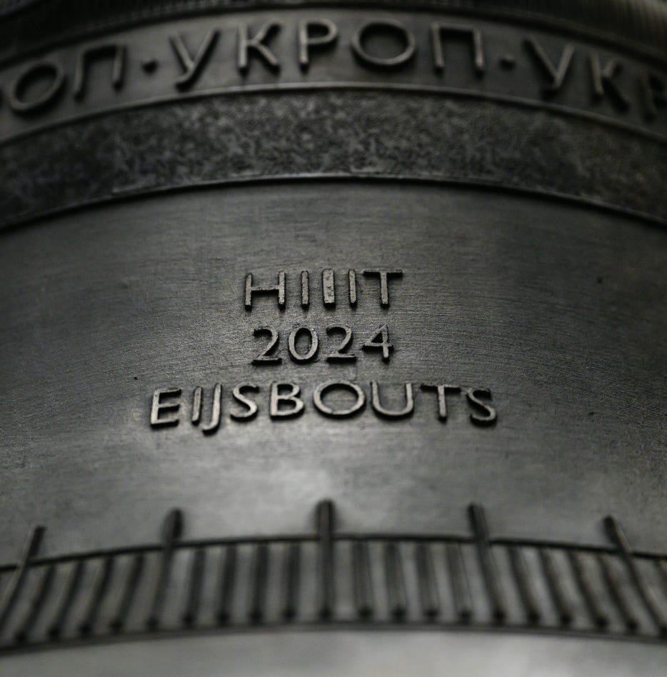 In 2024, 8 kilograms of Ukrainian bullet casings were melted down into bars in Kyiv, then shipped to the Netherlands and cast into a bell at the Royal Eijsbouts Bell Foundry. Weighing a total of 45 kilograms (just under 100 pounds), this new bell, the artists say, “heralds the beginning of a natural rotation: destruction becomes beauty once again.”
